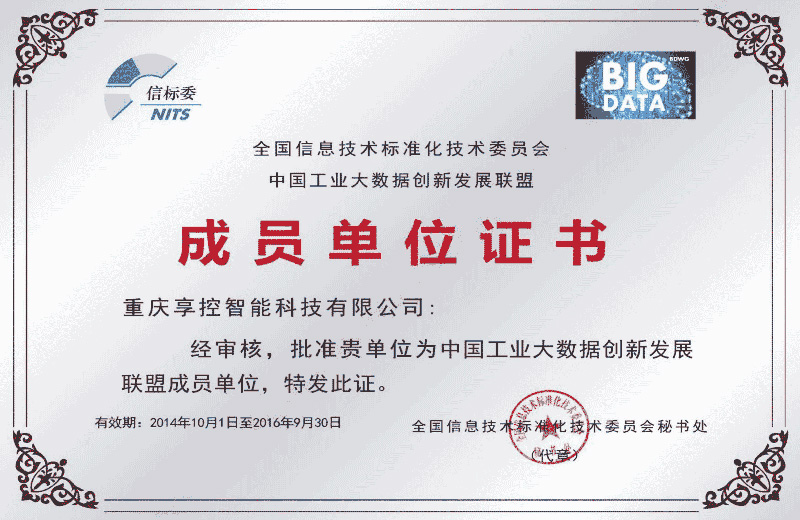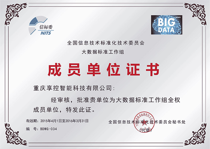 全國信標(biāo)委批準重慶享控智能科技有限公司為“大數(shù)據(jù)標(biāo)準工作組全權(quán)成員單位”